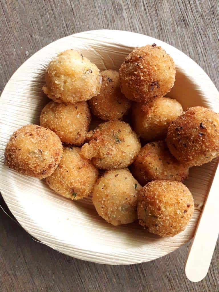 Potato lollipops are one of the simplest and cleanest vegetarian party appetizers you can make. Crispy on the outside and melt-in-your-mouth soft on the inside, these bite-sized treats are packed with flavor. Add herbs, seasonings, and cheese to make them extra delicious. Kids especially love these cheesy lollipops!