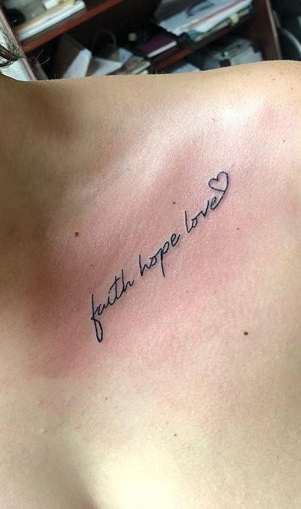 You can place this tattoo right under the collarbone, where there’s ample space to expand your design. Instead of using symbols, consider having the words “Faith, Hope, Love” written in your favorite font, elegantly spreading across this area. Symbols also look fantastic in this spot, allowing for creative and meaningful expressions of these core values. Whether you choose text or imagery, this location offers a stylish and visible reminder of what you cherish most.
