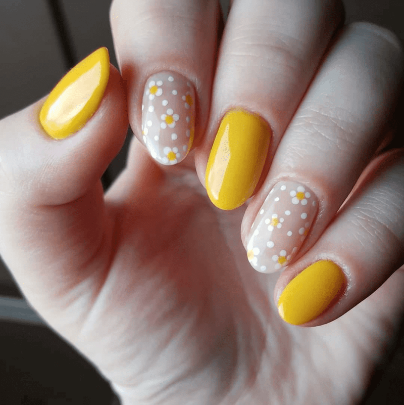 YELLOW NAILS WITH A MIX OF SMALL FLORAL DESIGNS AND POLKA DOTS