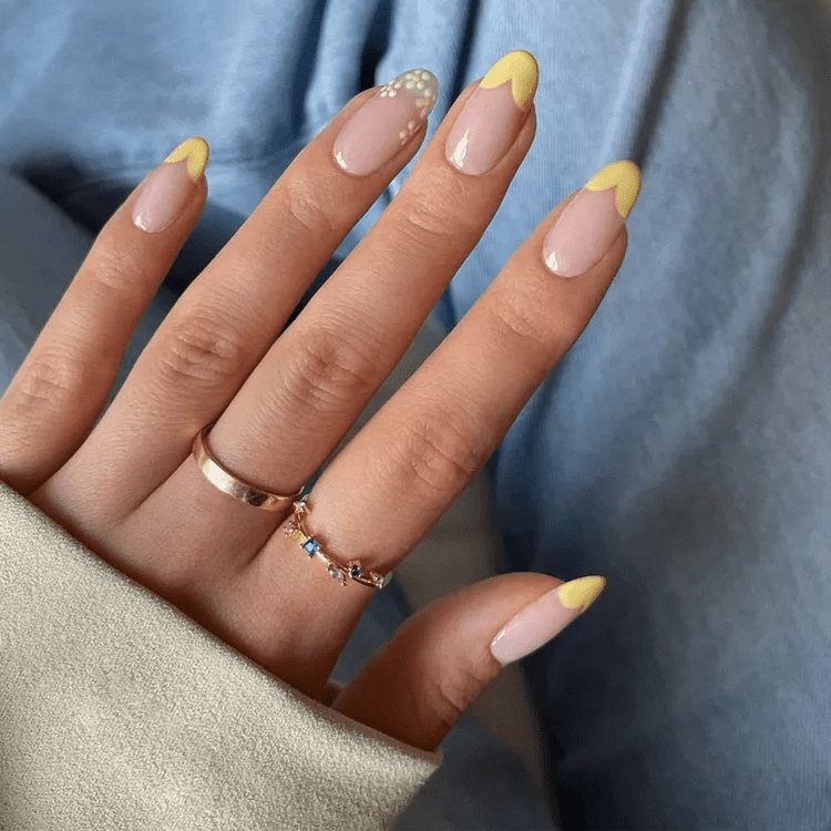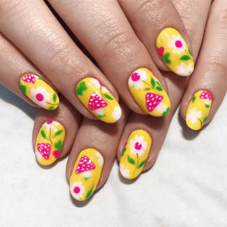 YELLOW NAILS WITH A WREATH OF FLOWERS AROUND THE CUTICLE