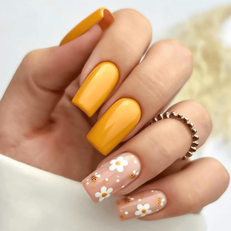 Calling all sunshine lovers! Feeling the urge to brighten your fingertips with a pop of color? Look no further than stunning yellow nails adorned with gorgeous floral designs! This combination is a guaranteed mood-booster, injecting a dose of summer vibes and playful charm into your everyday look.