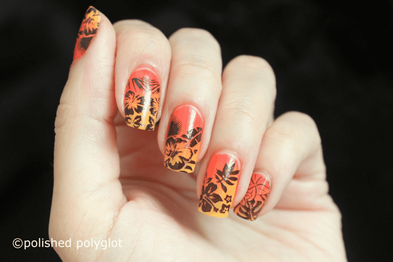 YELLOW AND ORANGE GRADIENT NAILS WITH BLACK FLORAL SILHOUETTE’