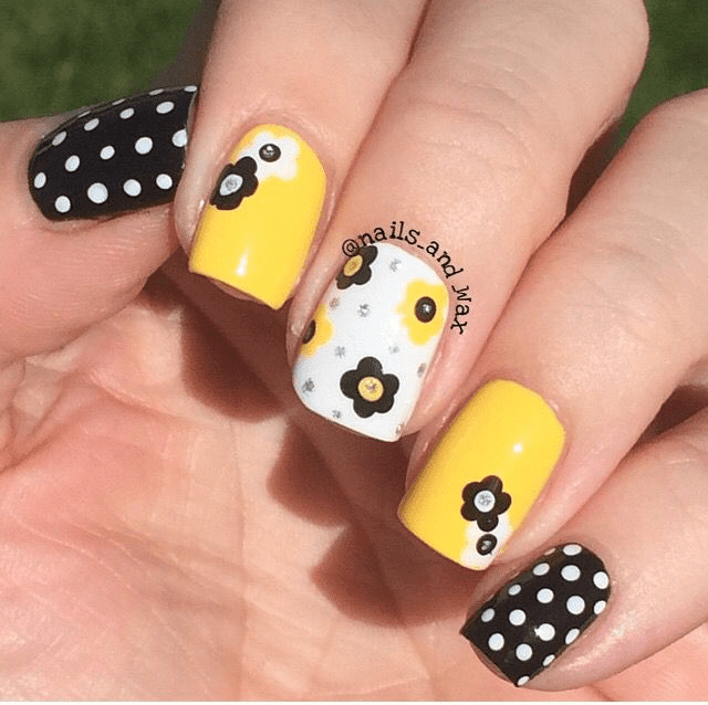 Polka dots are a fun and playful design that can be easily incorporated into a floral manicure. Paint your nails yellow and white polka dots, then add a small flower to each nail.