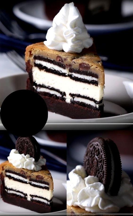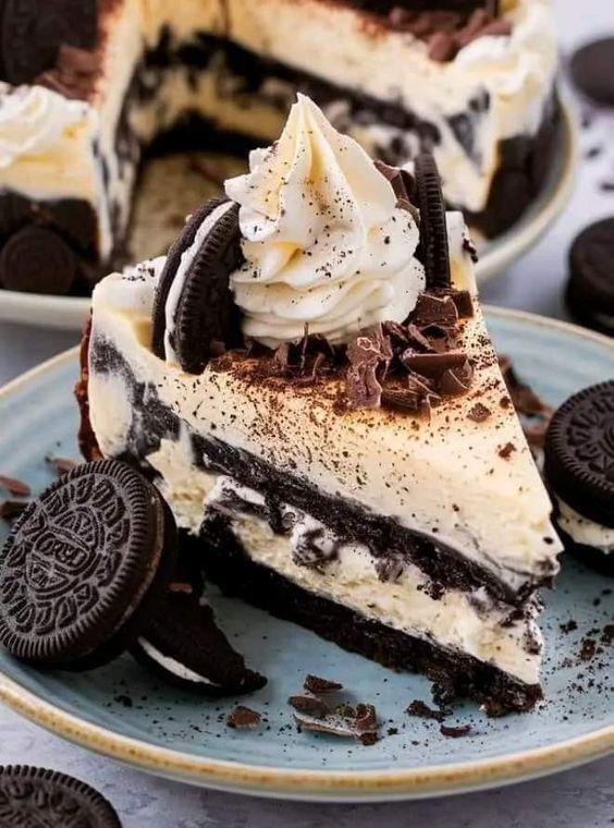 - Serve: Slice and serve with whipped cream and an extra cookie on top for garnish.