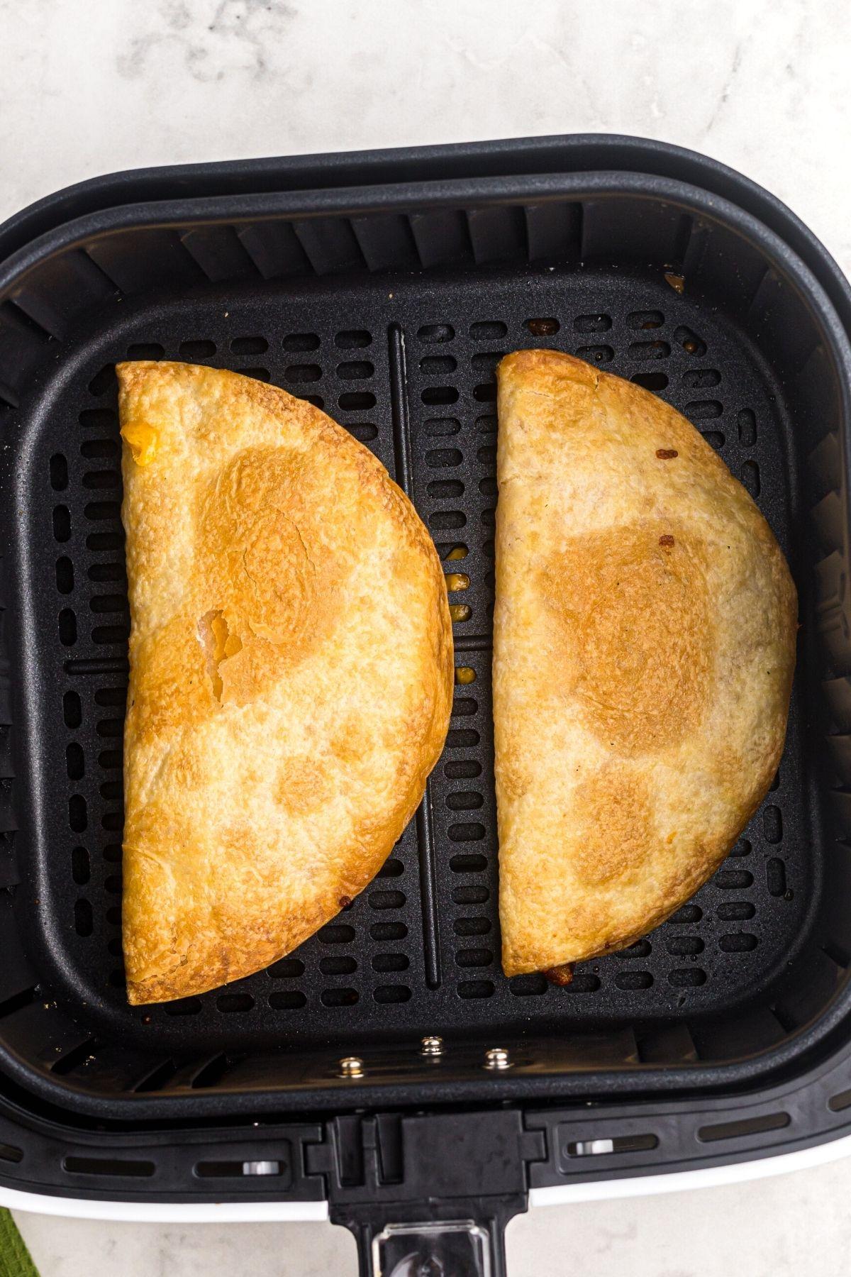 - Air fry at 350°F for 8-10 minutes, flipping halfway through, until the tortillas are golden brown and crispy. After 2 minutes, open the basket and gently press the tortillas together if they have opened. The melted cheese will help seal them.