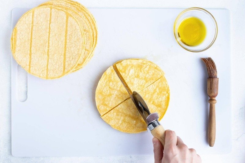 • Brush before cutting: It’s easier to apply the oil while the tortillas are whole, so brush them before slicing into triangles.