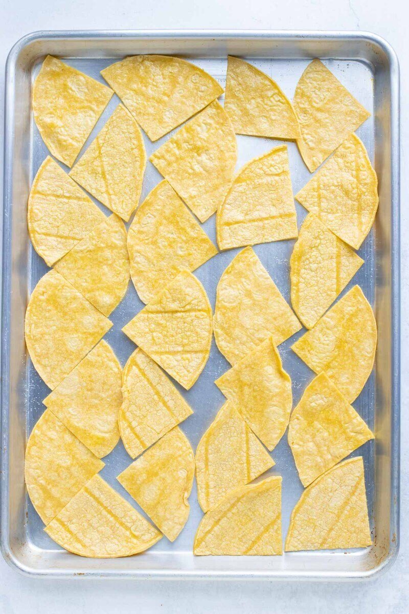 Place the coated tortilla pieces in a single layer on a large baking sheet. Slight overlap is fine, but use an additional baking sheet if needed to avoid overcrowding.