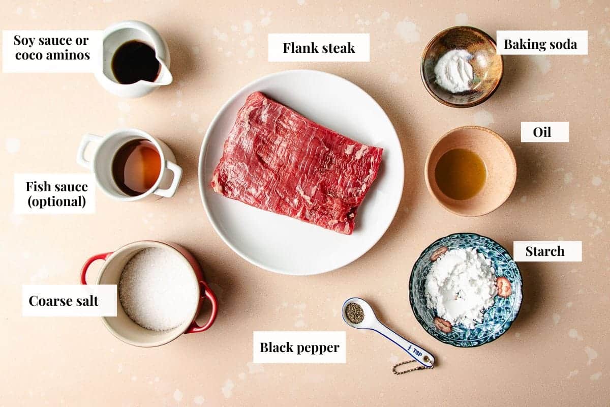 • Tenderize and Marinate: In a bowl, add the sliced beef and season with coconut aminos (or soy sauce), fish sauce (if using), olive oil, black pepper, baking soda, tapioca starch, and sesame oil (optional). Gently mix the ingredients to coat the beef. Cover and marinate for 15 to 30 minutes in the fridge or up to 1 day in advance.