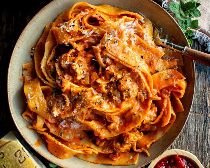 CREAMY CALABRIAN CHILI PAPPARDELLE WITH SAUSAGE & FENNEL