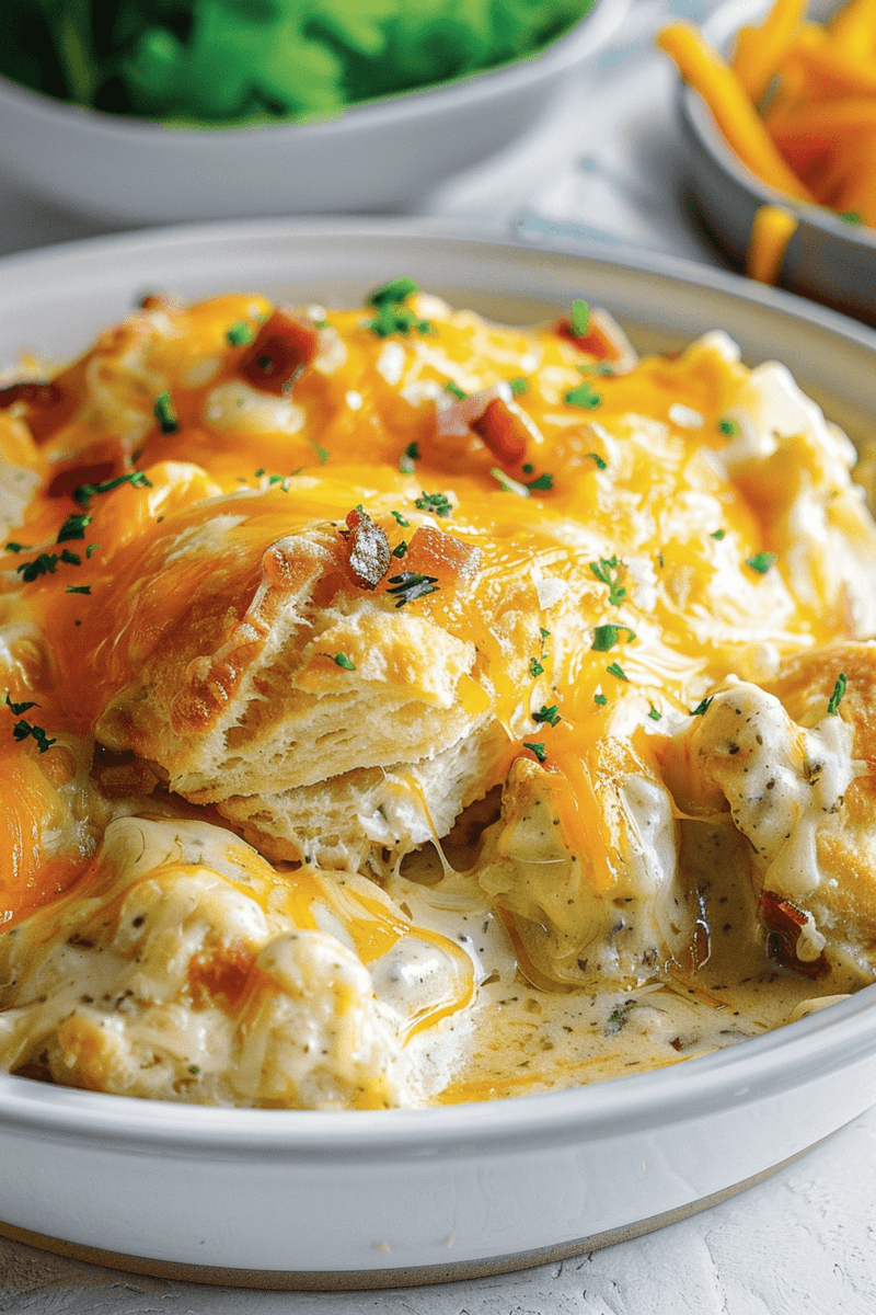 Indulge in a cozy casserole brimming with tender chicken, rich creamy soup, crispy bacon, zesty ranch, pillowy biscuit dough, and ...