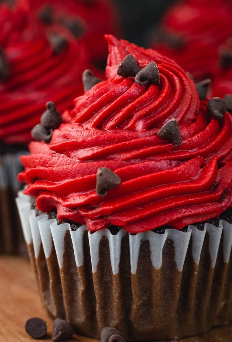 This red velvet buttercream frosting combines cream cheese with mini chocolate chips for a delightful treat. The vibrant red icing ...