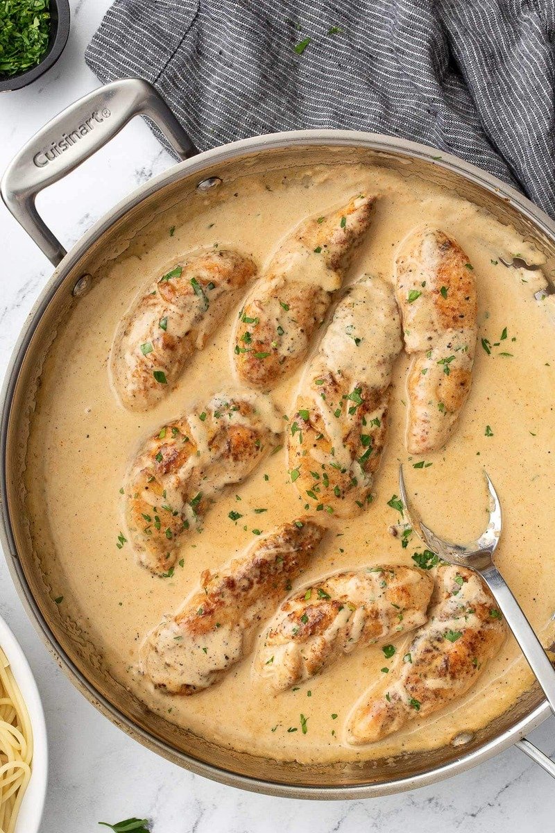 This Chicken Lazone recipe is a quick and easy 30-minute dinner featuring pan-seared chicken tenders coated in a rich, buttery ...