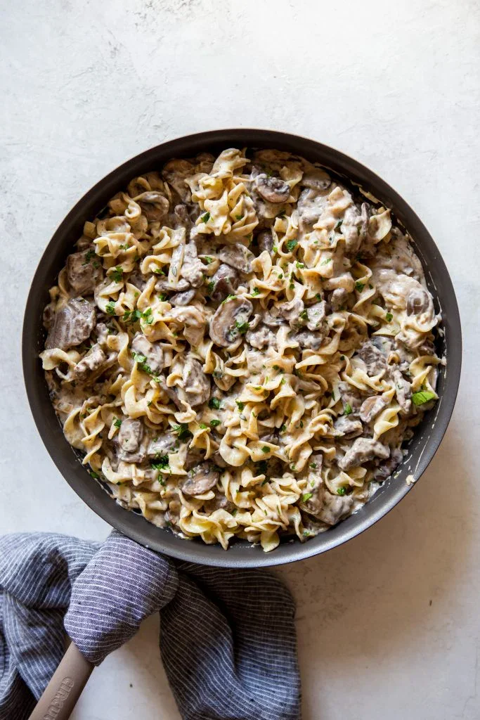 This traditional Beef Stroganoff features tender beef strips and mushrooms in a rich, creamy sour cream sauce, served over egg ...