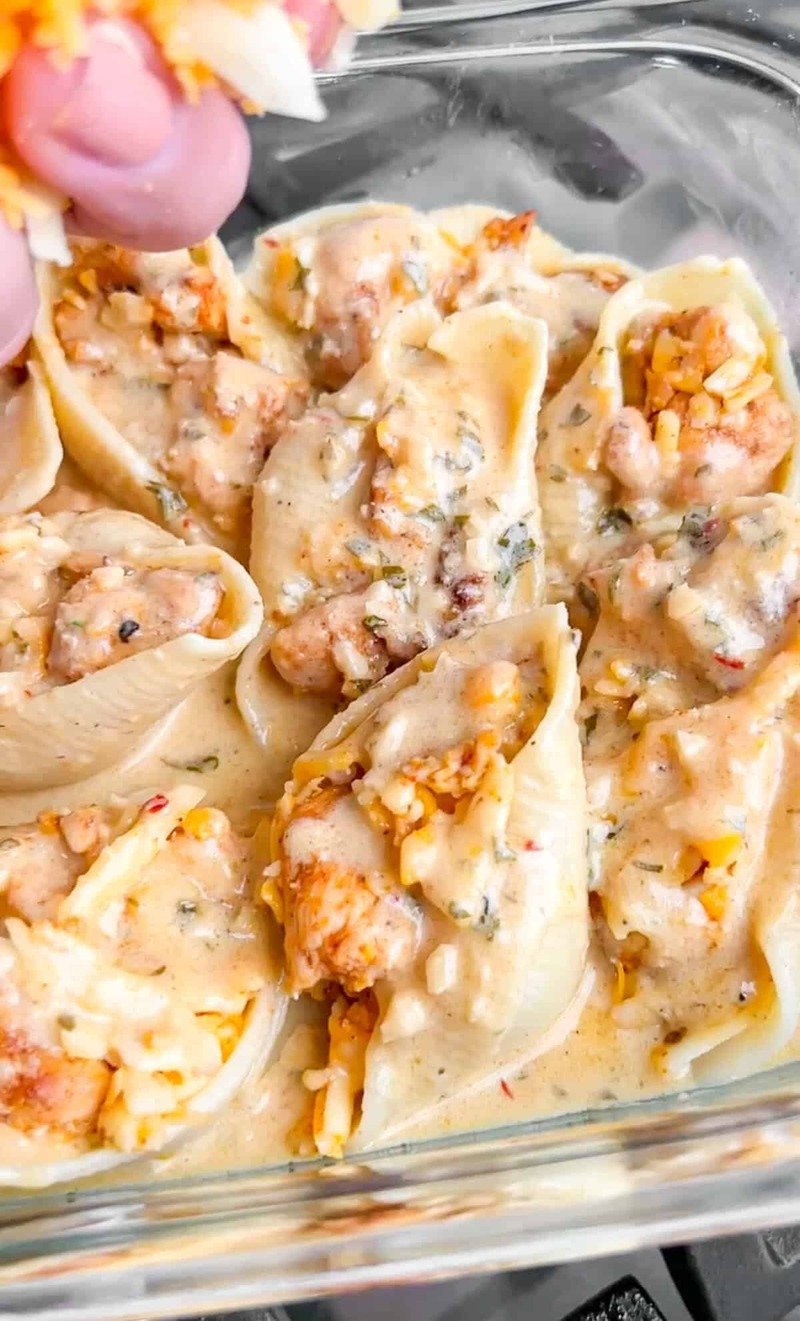 - Stuff each shell with a generous spoonful of the chicken and cheese mixture, placing them side by side in the dish.
