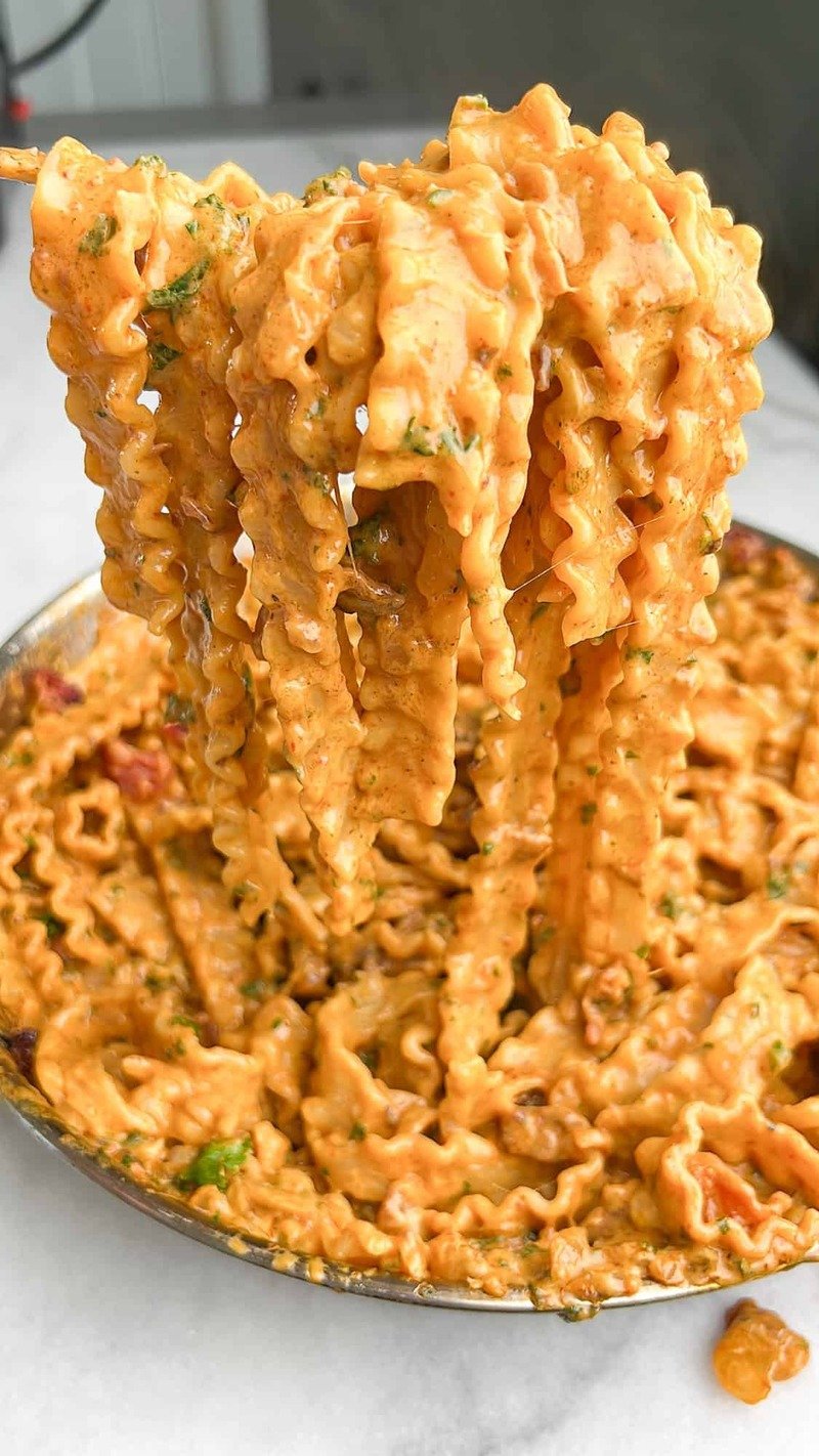 Chipotle Bacon Alfredo features crispy bacon crumbled into a smoky chipotle-parmesan cream sauce, generously coating mafaldine noodles. It’s the perfect blend of Mexican and Italian flavors you never knew you needed.