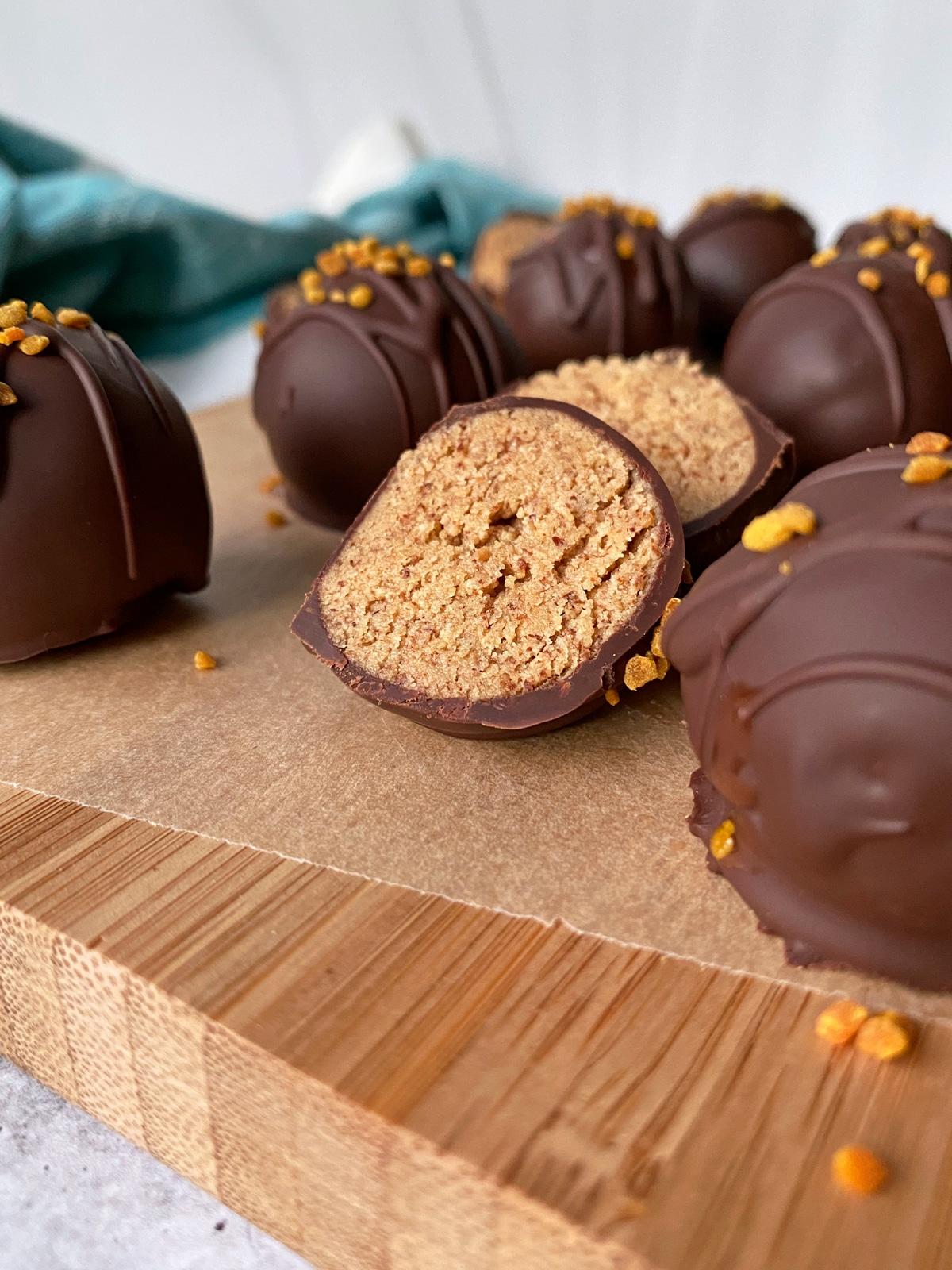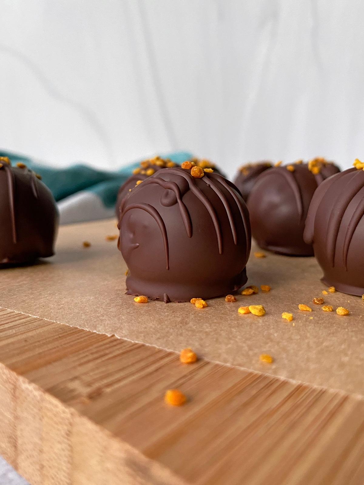 • Coat the Bites: Remove the frozen balls from the freezer and dip each one into the melted chocolate, coating them completely. Place them on parchment paper. If desired, sprinkle with toppings like bee pollen before the chocolate sets.