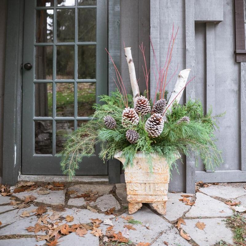 A tall urn makes a lovely decorative outdoor planter for front porches and back patios. To add vibrant color, try using berries in shades like red, yellow, and purple, along with brightly colored branches such as White Birch, Red Twig Dogwood, and Yellow Twig Dogwood.