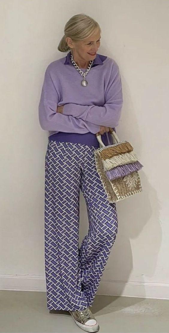 Lavender, the color of spring, brings both beauty and vibrancy to any wardrobe. A cozy lavender sweater paired with patterned trousers embodies the relaxed yet lively spirit of the season. Perfect for a leisurely countryside stroll or a casual gathering with friends, this outfit combines comfort and style effortlessly. Add a statement necklace and a woven bag to introduce texture and visual interest, completing a look that’s as chic as it is relaxed.