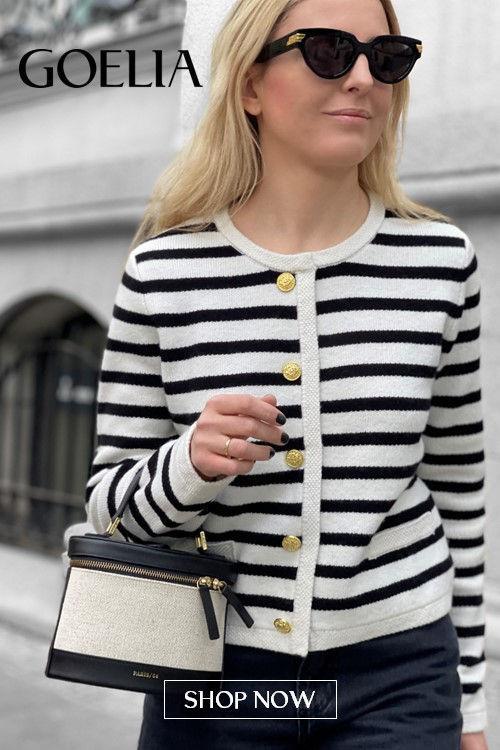 A nautical-themed cardigan with horizontal stripes perfectly captures the essence of spring by the shore. This look pays homage to the classic maritime style, making it ideal for a yacht trip or a seaside brunch. The timeless stripes are complemented by gold-button details, adding a subtle touch of luxury. Pair with a simple bag and sunglasses for a chic, effortlessly stylish outfit.
