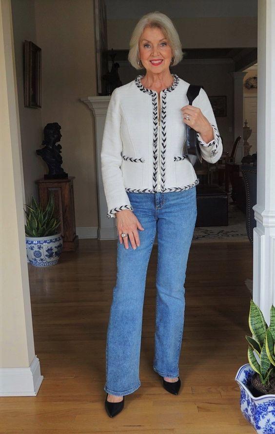 Denim remains a timeless favorite, and a well-fitted pair of jeans serves as a versatile foundation for any spring wardrobe. Paired with a chic jacket featuring elegant trim details, this outfit effortlessly bridges the gap between casual and polished. Perfect for a range of activities, from running errands to catching up with friends over coffee, it offers both comfort and style.
