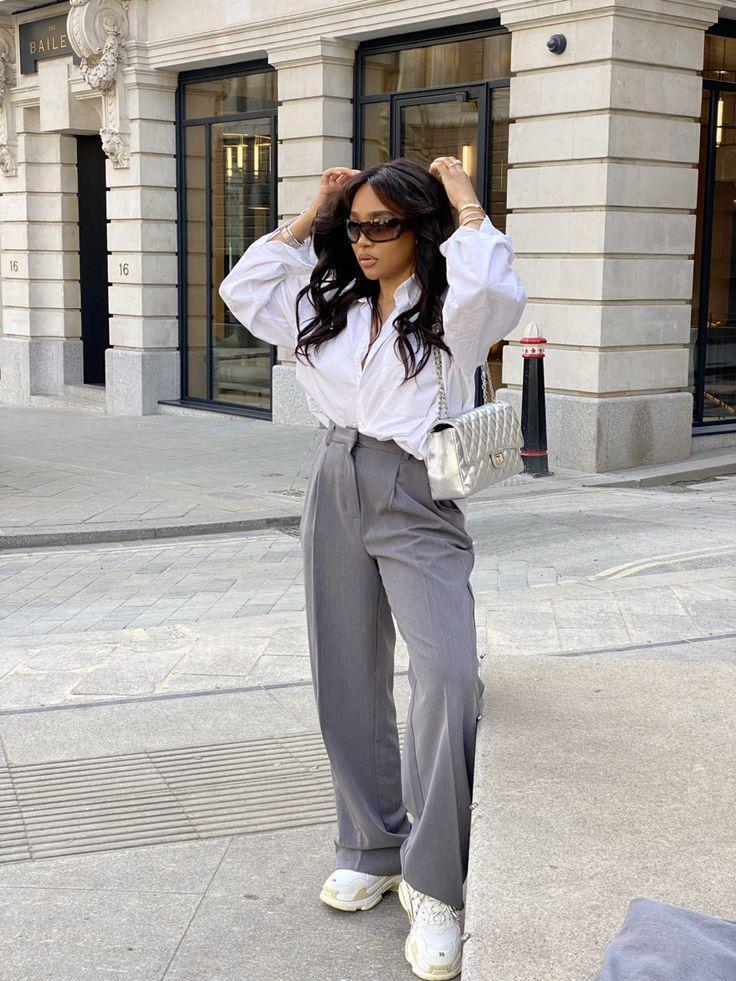 Casual doesn’t have to mean sacrificing style. A pair of tailored grey trousers with a relaxed fit is the perfect choice for a walk on the beach with your furry friend or a laid-back NBA game. Paired with a light tank top and accessorized with a chic kepi hat, this look effortlessly blends casual elegance, taking you from dawn to dusk with ease.