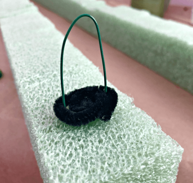 To ensure the hooks are secure, I coiled a half-pipe cleaner around the base of each hook and pressed it into the styrofoam. This provides extra support and prevents the hooks from slipping out.