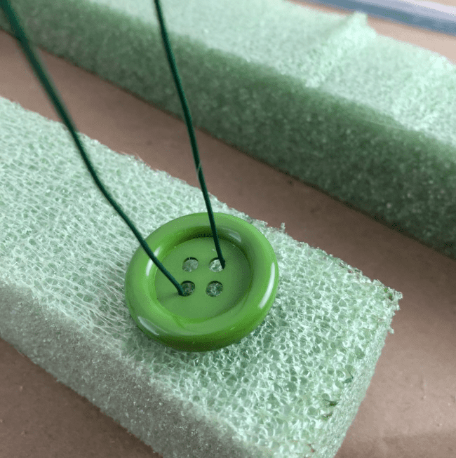 On the backside of my foam, I used a button method to prevent the wire from cutting through the material. After threading the wire through the button, I twisted the two ends into a loop, creating a hanger to attach the foam to a Command hook.