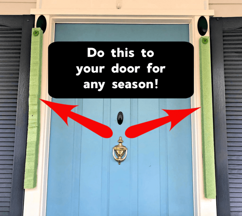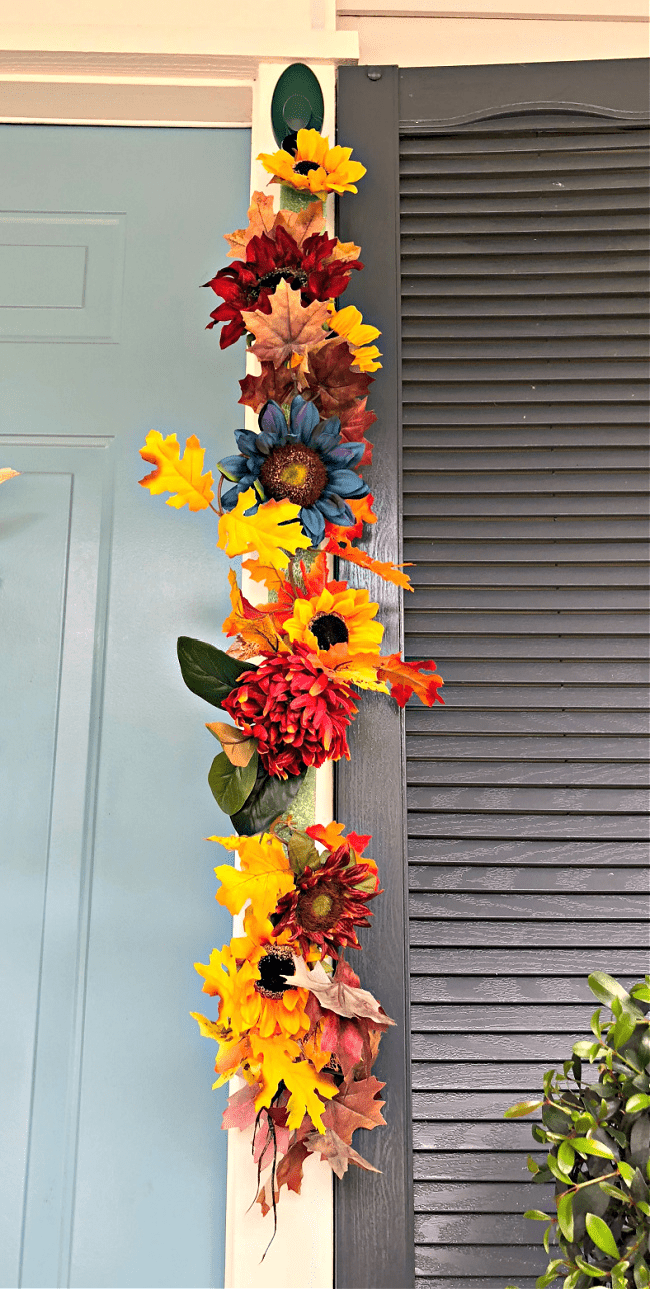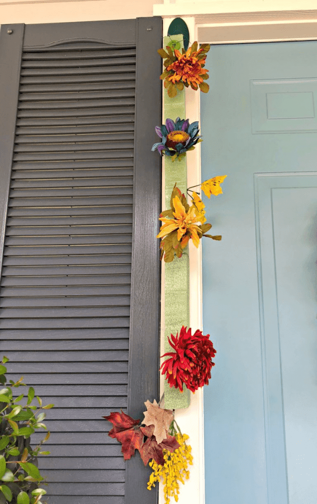 To keep my decorations narrow along the sides of my front door, I used low-temperature hot glue and a package of Dollar Tree fall leaves to cover the edges of the styrofoam.