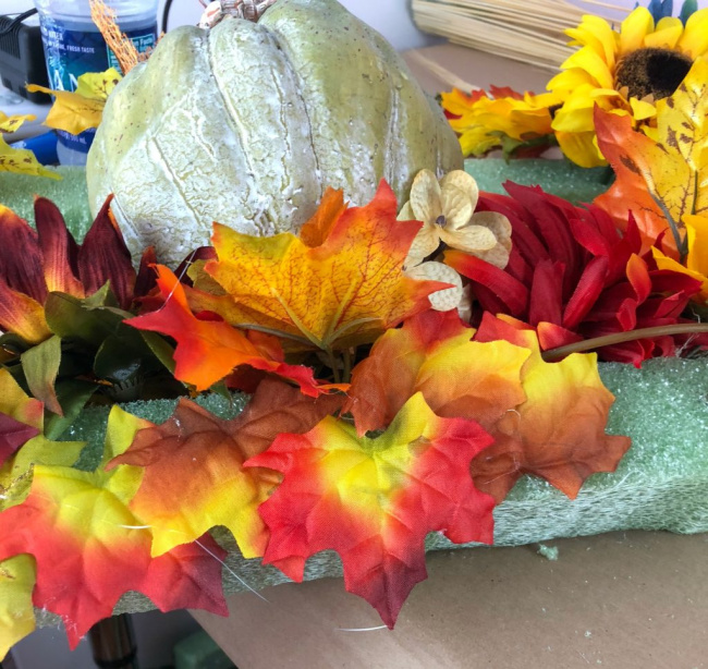 I positioned the flowers and fall leaves toward the front of the styrofoam for maximum visibility. Once the fall foliage and blooms were in place, I added an assortment of pumpkins and a variety of gourds to complete the look.