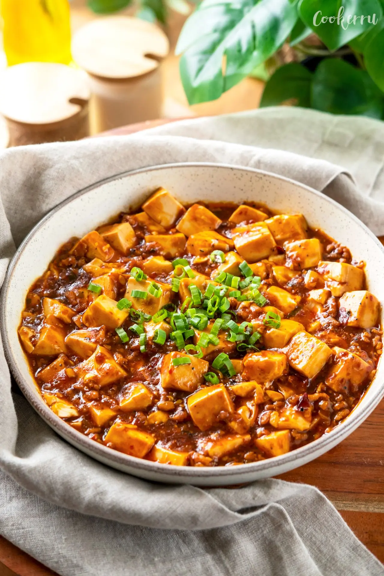 - Transfer the mapo tofu to a serving bowl, garnish with the reserved green onion, and serve immediately over steamed rice. Enjoy!