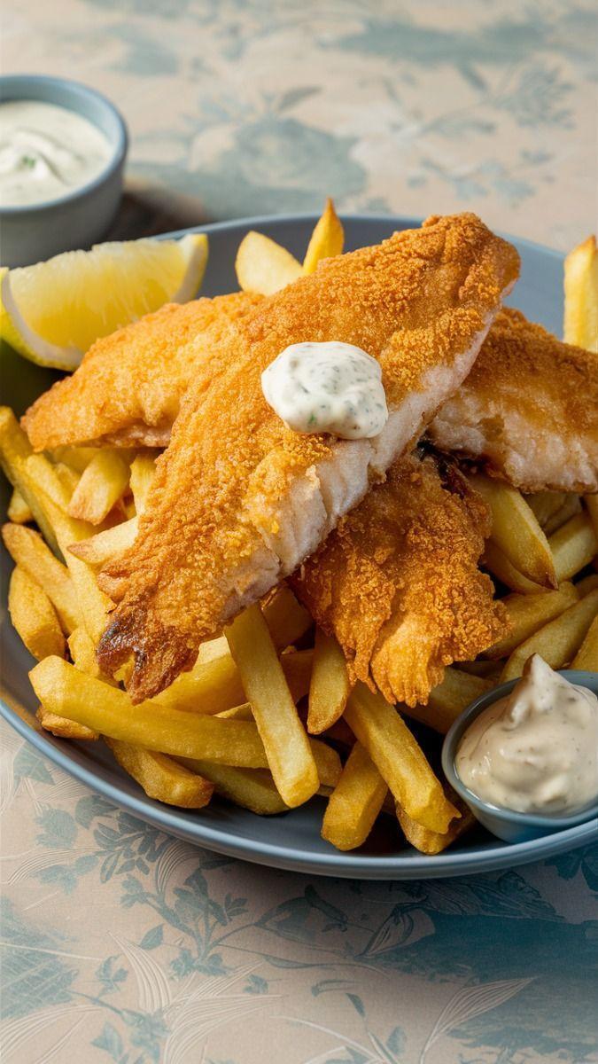 • Serve the crispy fish and chips with the tartar sauce on the side and enjoy!
