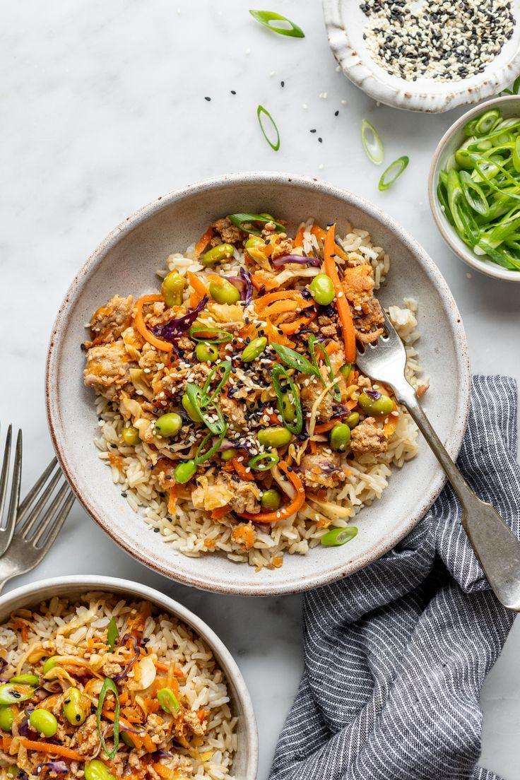 To Serve: Serve the egg roll in a bowl over white rice, if desired, and garnish with green onions, toasted sesame seeds, and sriracha mayo, if using.
