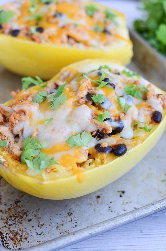 - Assemble & Bake: Spoon the turkey mixture evenly into the spaghetti squash shells. Sprinkle with cheddar and Monterey Jack cheese. Return to the oven and bake for about 10 minutes, or until the cheese is melted and bubbly.