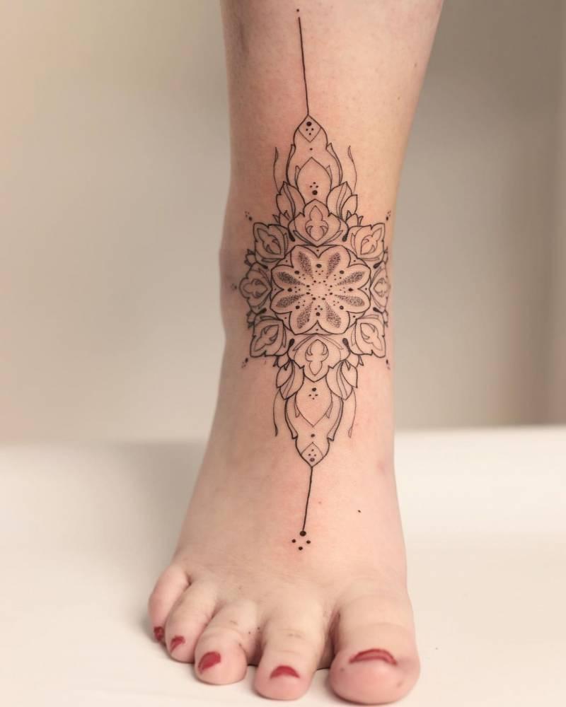 Mandala tattoos are a popular and stunning choice for foot tattoos, characterized by intricate circular patterns formed from shapes and symbols. The mandala holds deep symbolism, often associated with harmony, balance, and tranquility. While these designs may be time-consuming to create, they offer a visually captivating and calming effect, serving as a reminder to pause and find balance in life. Whether choosing a single mandala or opting for a vibrant, attention-grabbing design, these foot tattoos make a striking statement.