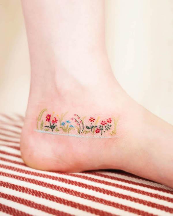 This distinctive inner foot tattoo beautifully captures the essence of blooming flowers and leaves. The harmonious blend of colors, diverse shapes, and intricate lines converges to form a vibrant spring garden flourishing on the skin. The sleek lines contribute to maintaining simplicity in the design, ensuring vibrancy without any semblance of clutter. This tattoo is a testament to the artistry of nature etched with finesse on the canvas of the skin.