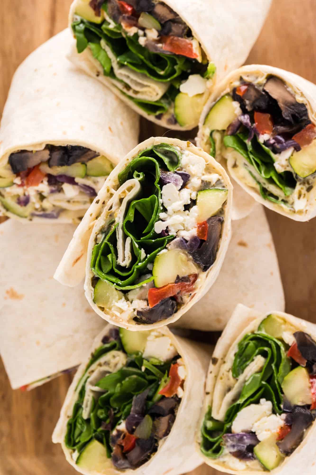 • Arrange a quarter of the roasted vegetables in the center of each wrap, followed by a quarter of the crumbled feta and a handful of spinach. Roll the wraps tightly to enclose the filling.