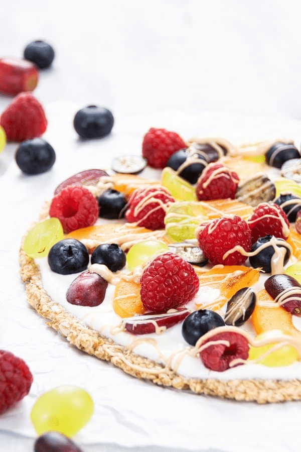 - Assemble the Pizza: Spread 2-3 tablespoons of coconut yogurt over the crust. Arrange the fruits on top as desired.