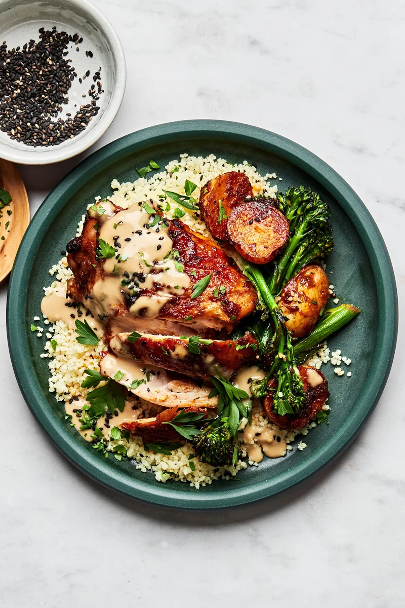 - To serve, drizzle tahini sauce over the chicken, then sprinkle with sesame seeds and parsley. Serve with couscous on the side.