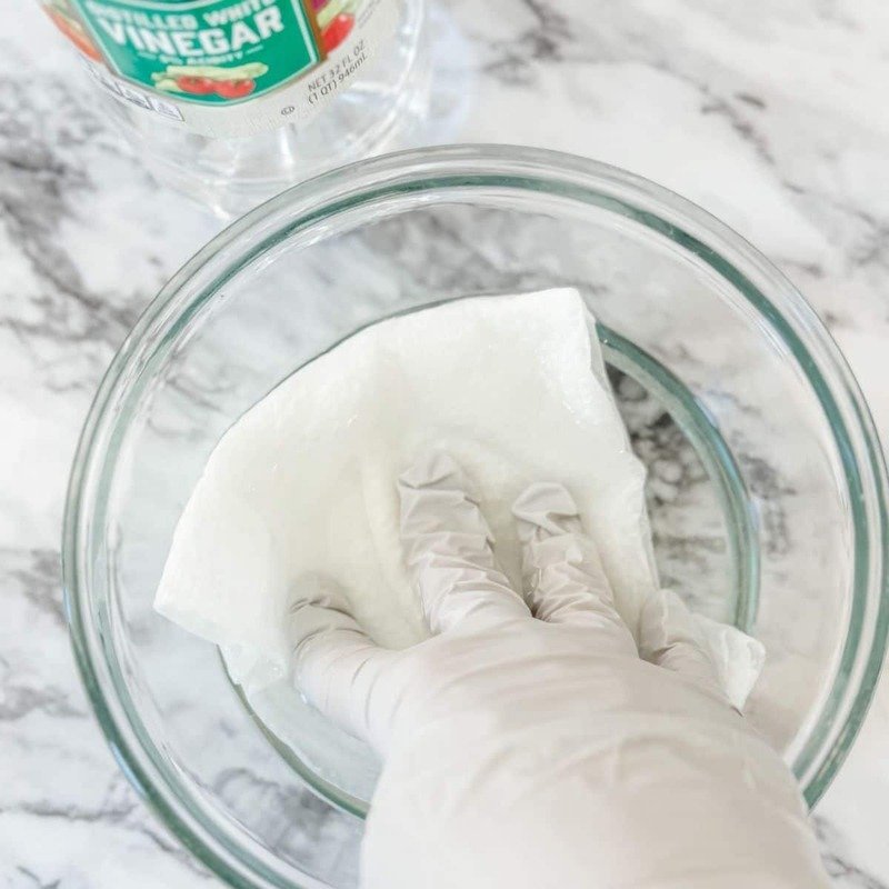 - Step 3: Soak a paper towel in white vinegar until saturated. (I recommend wearing rubber gloves for this part since it can get a bit messy.)