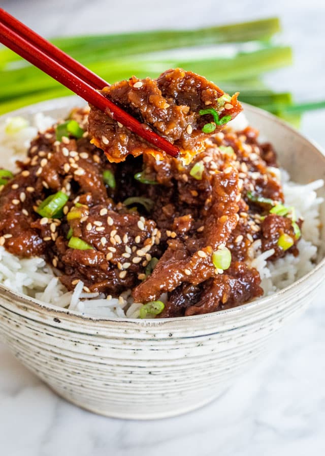 - Serve the Mongolian Beef over rice (or cauliflower rice) and top with green onions, sesame seeds, and optional red pepper flakes or sriracha sauce.