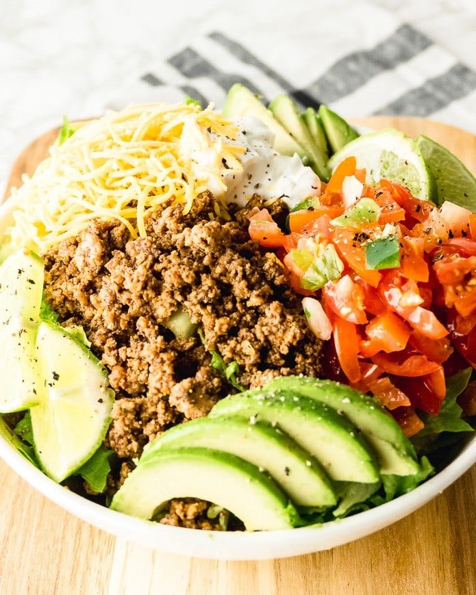 Craving tacos on keto? Try this quick and easy keto taco salad for a perfect weeknight meal! It’s loaded with delicious low-carb ingredients like seasoned ground beef, salsa, avocado, and shredded cheese.