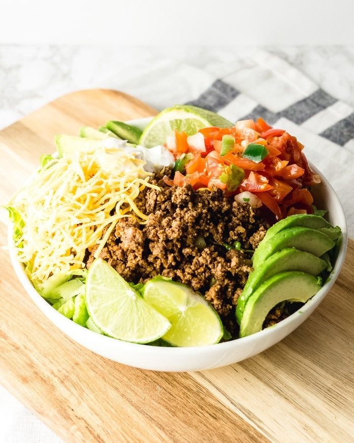 - Assemble the salad: Add the lettuce to a large bowl and top with seasoned beef, salsa, sour cream, shredded cheese, and avocado slices. Serve with a lime wedge if desired.