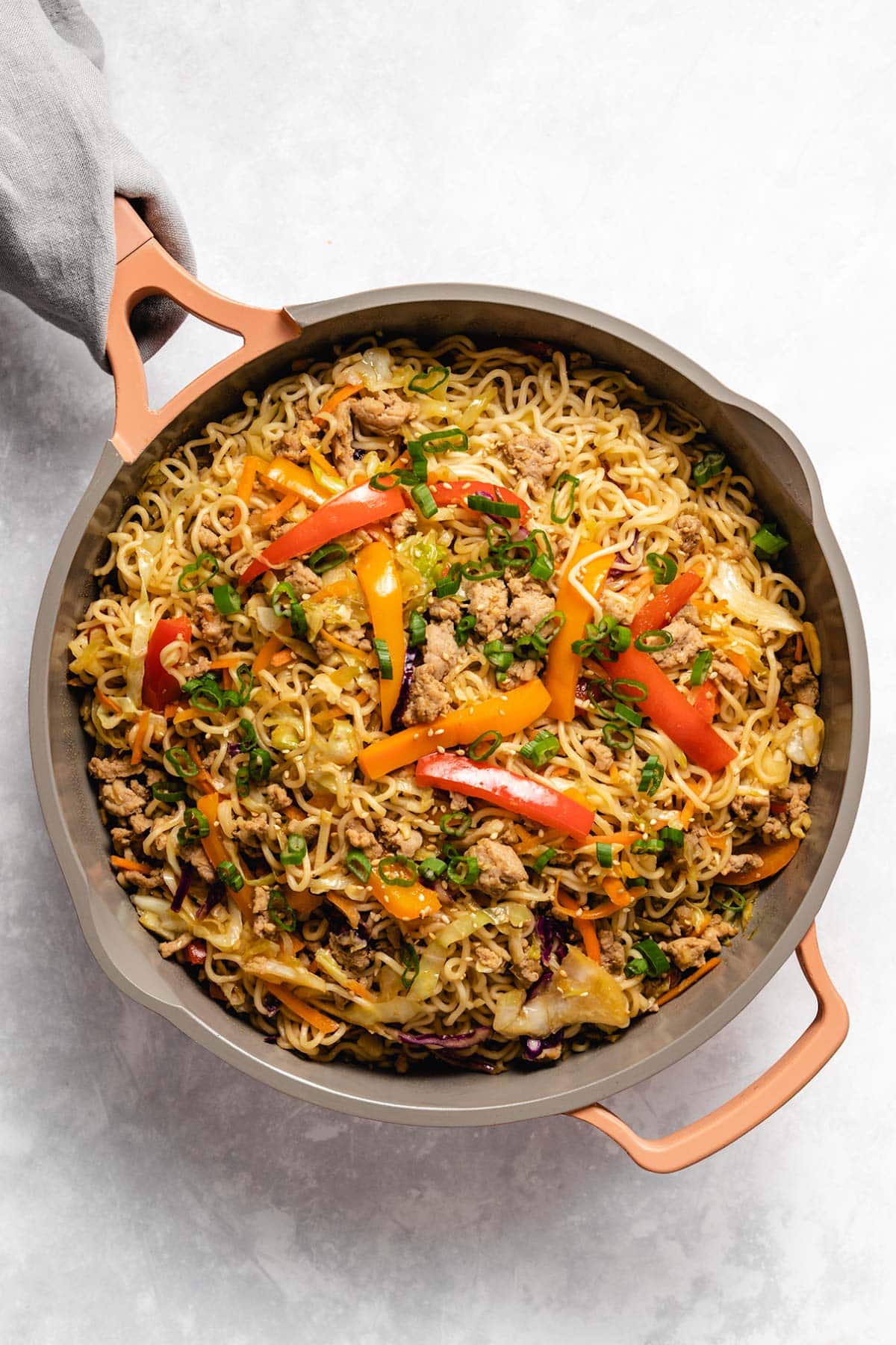 • Once the peppers and coleslaw have cooked for about 2 minutes, add the ramen noodles to the boiling water. Boil for 3 minutes (check the package instructions and adjust as needed). Stir the chicken and vegetables, then re-cover the skillet.