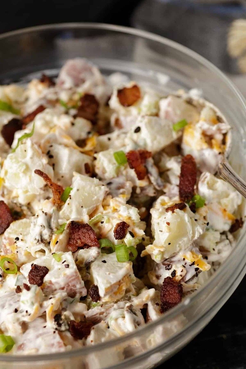 - In a large bowl, combine the cooled potatoes with grated cheese, chopped onions, and most of the bacon (save a little for topping). Pour the sour cream-ranch mixture over the potatoes and gently mix. Season with salt and pepper to taste. Refrigerate for at least 30 minutes to chill.