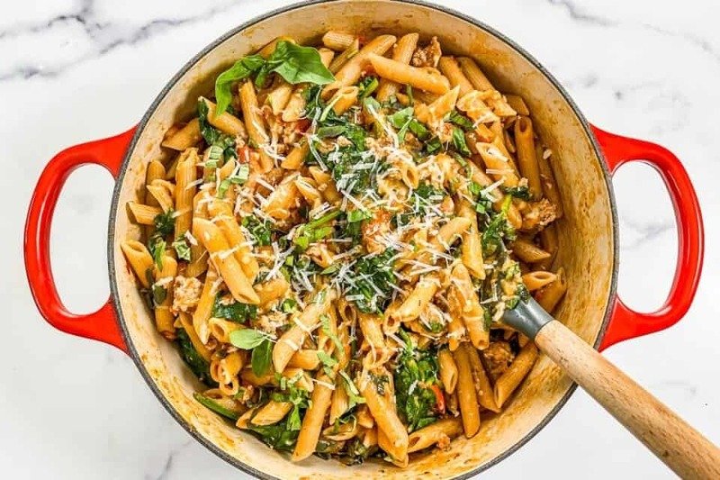 • Add the pasta, broth, marinara sauce, and heavy cream to the pan. Stir well and bring the mixture to a gentle boil. Reduce the heat to medium, cover, and let it simmer for 10–12 minutes, or until the pasta is cooked to al dente.