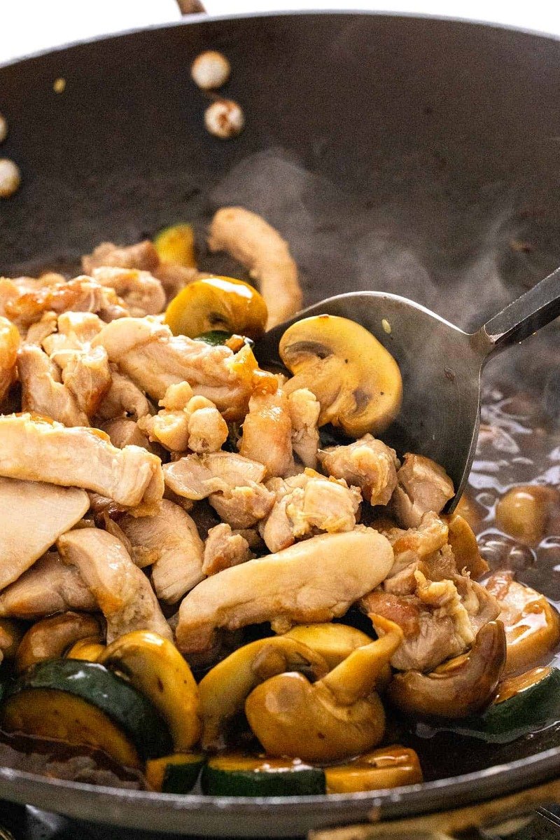 - Cook the Chicken: Heat a wok or skillet over high heat. Once hot, add vegetable oil and arrange the chicken slices in a single layer, leaving out any excess marinade. Sear the chicken without stirring to achieve a golden crust, about 30 seconds to 1 minute per side. Flip and sear the other side. Remove the chicken from the pan and set aside.