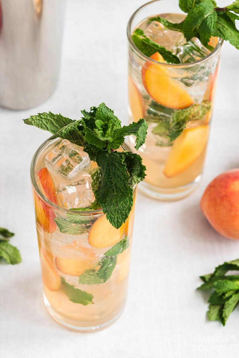 - Stir well and garnish with a peach slice and a sprig of mint.