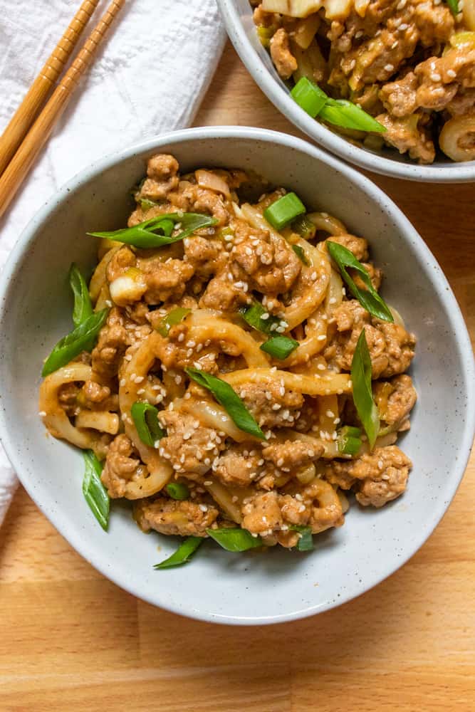 • Once the chicken is nearly cooked through, stir in the green onions, sesame seeds, and prepared udon noodles.