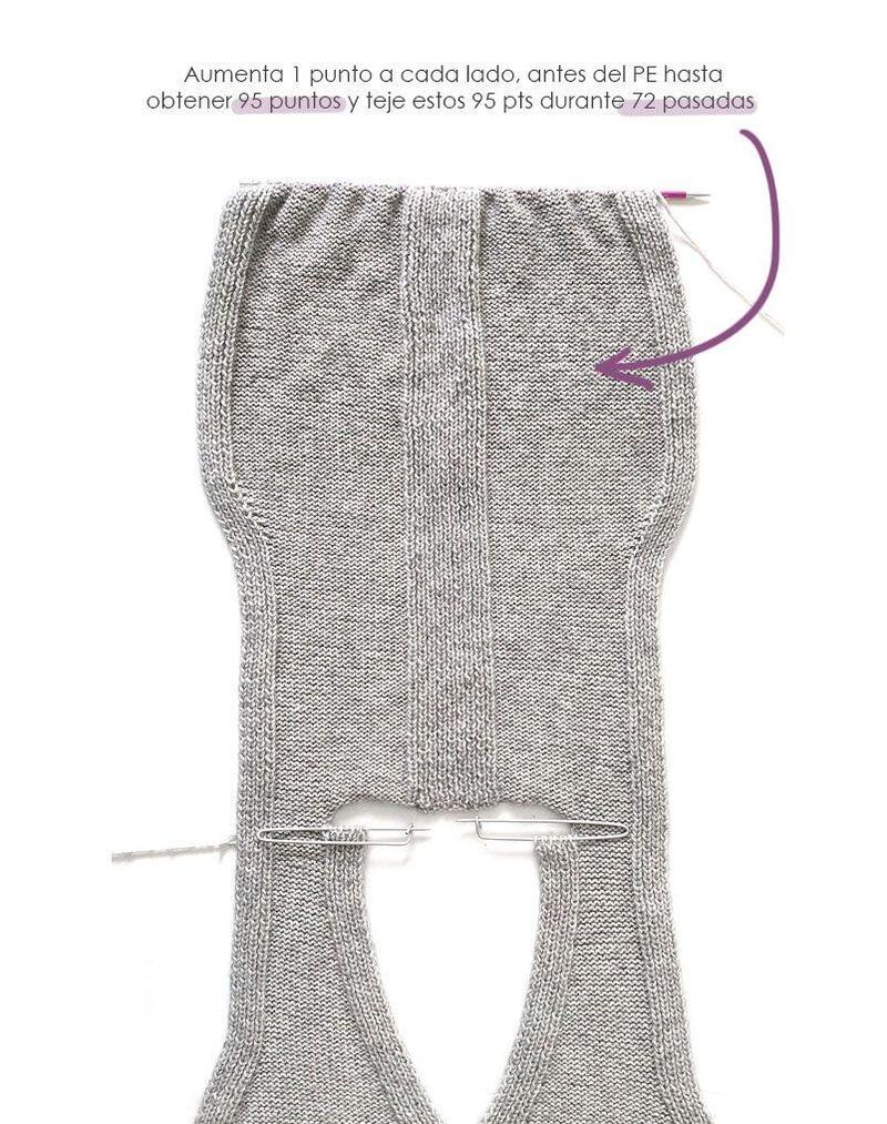 Once the bottom of the knitted vest is completed, on row 17 and odd rows up to row 87, you must knit 8 sl st (Rib Stitch), 31 sts.k, 17 sl st, 31 sts.k, 8 sl st.