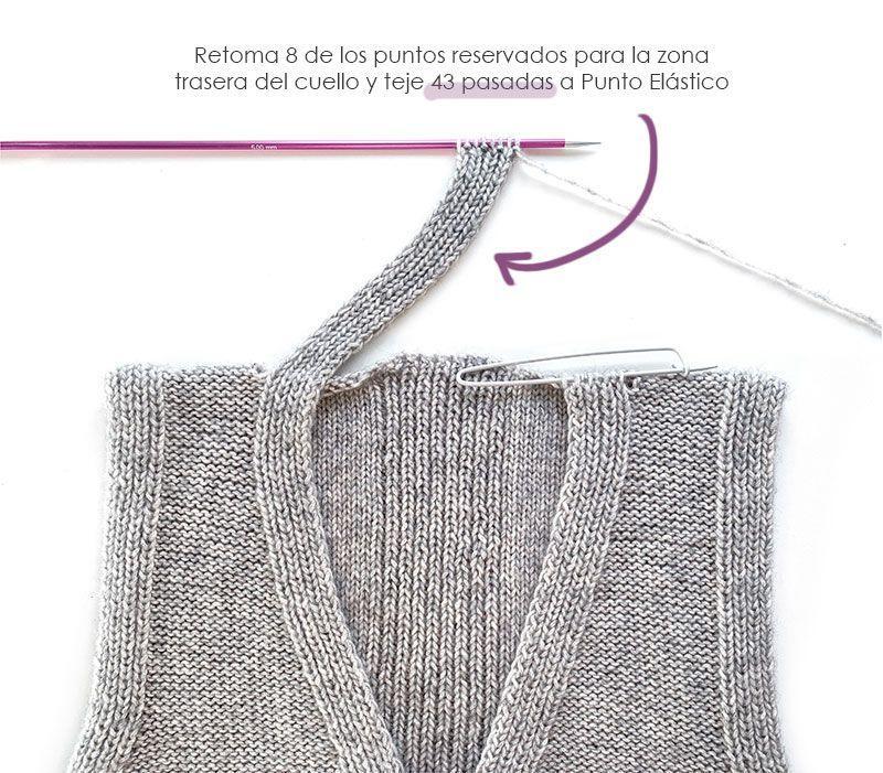 Once the first armhole, neckline and shoulder have been formed, we will resume the stitches reserved for the other part by returning them to our working needle.